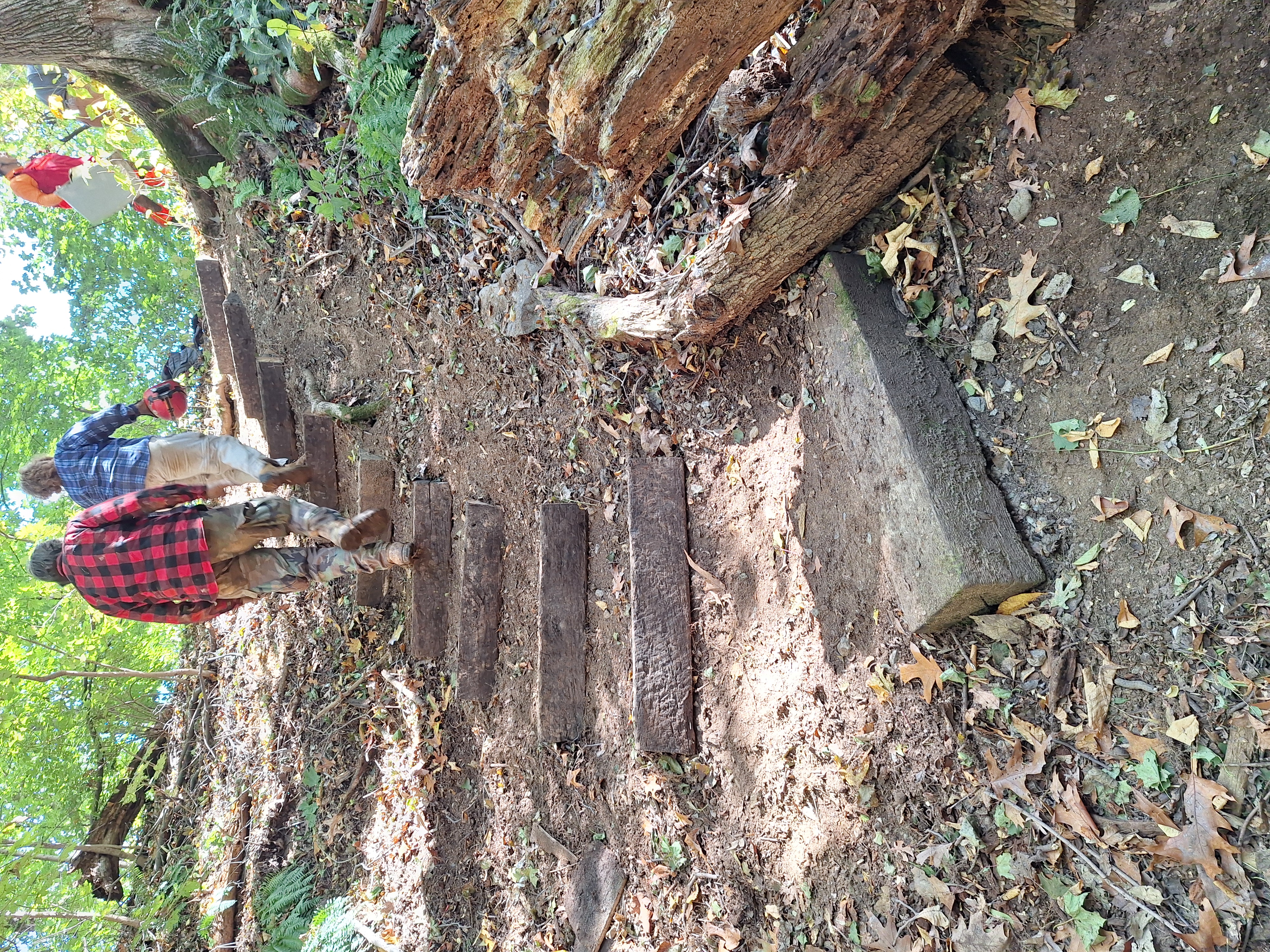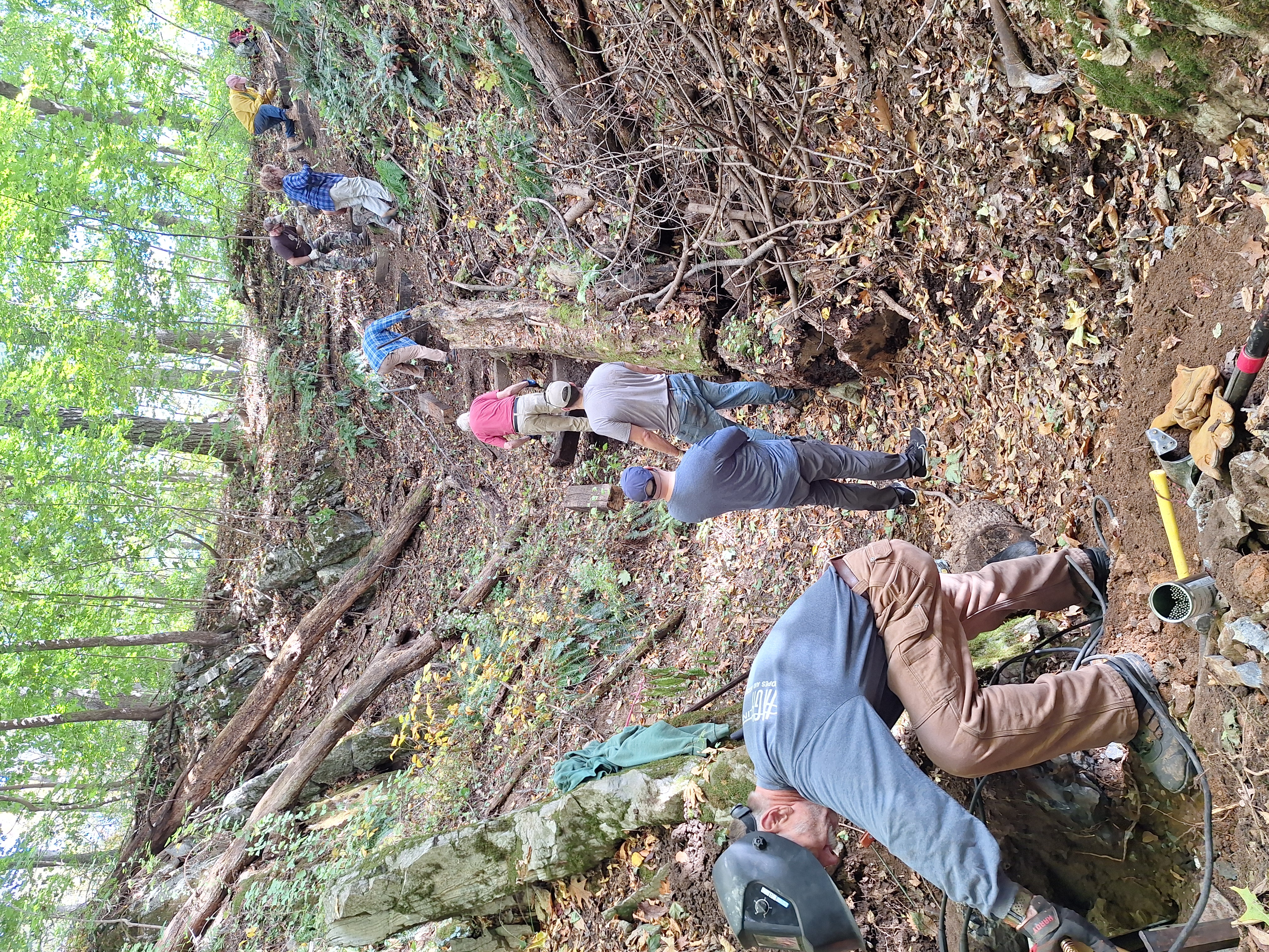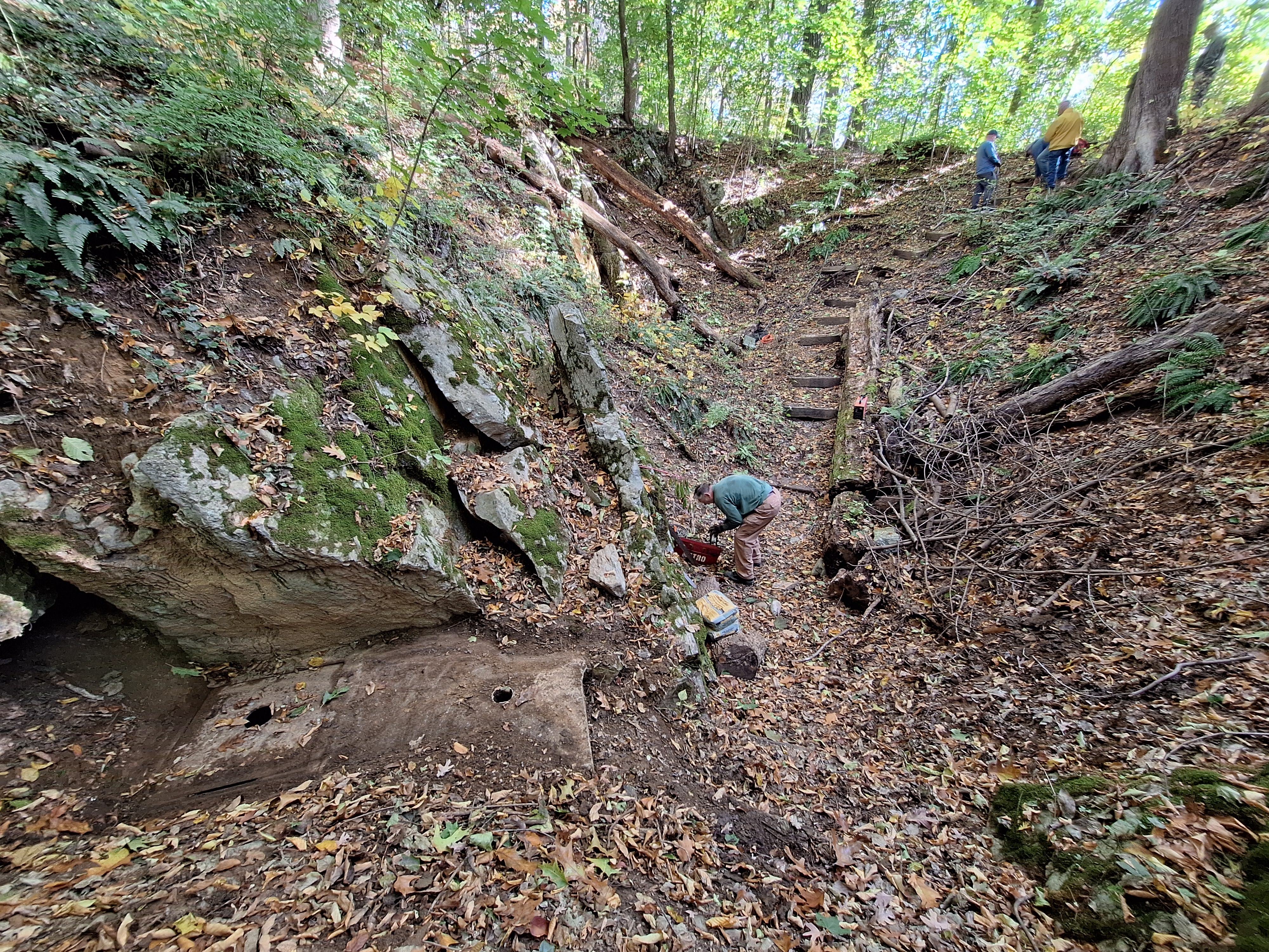 Creating a Safer Descent: We replaced old, decaying railroad ties to rebuild the stepped path leading down the hillside. These steps provide cavers with stable footing, reducing the risk of slips and protecting the slope from erosion caused by foot traffic.